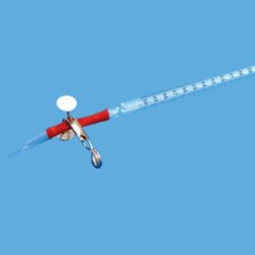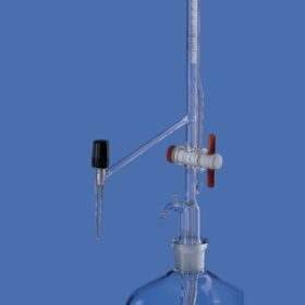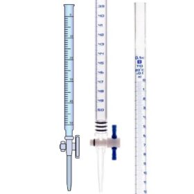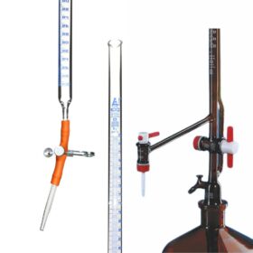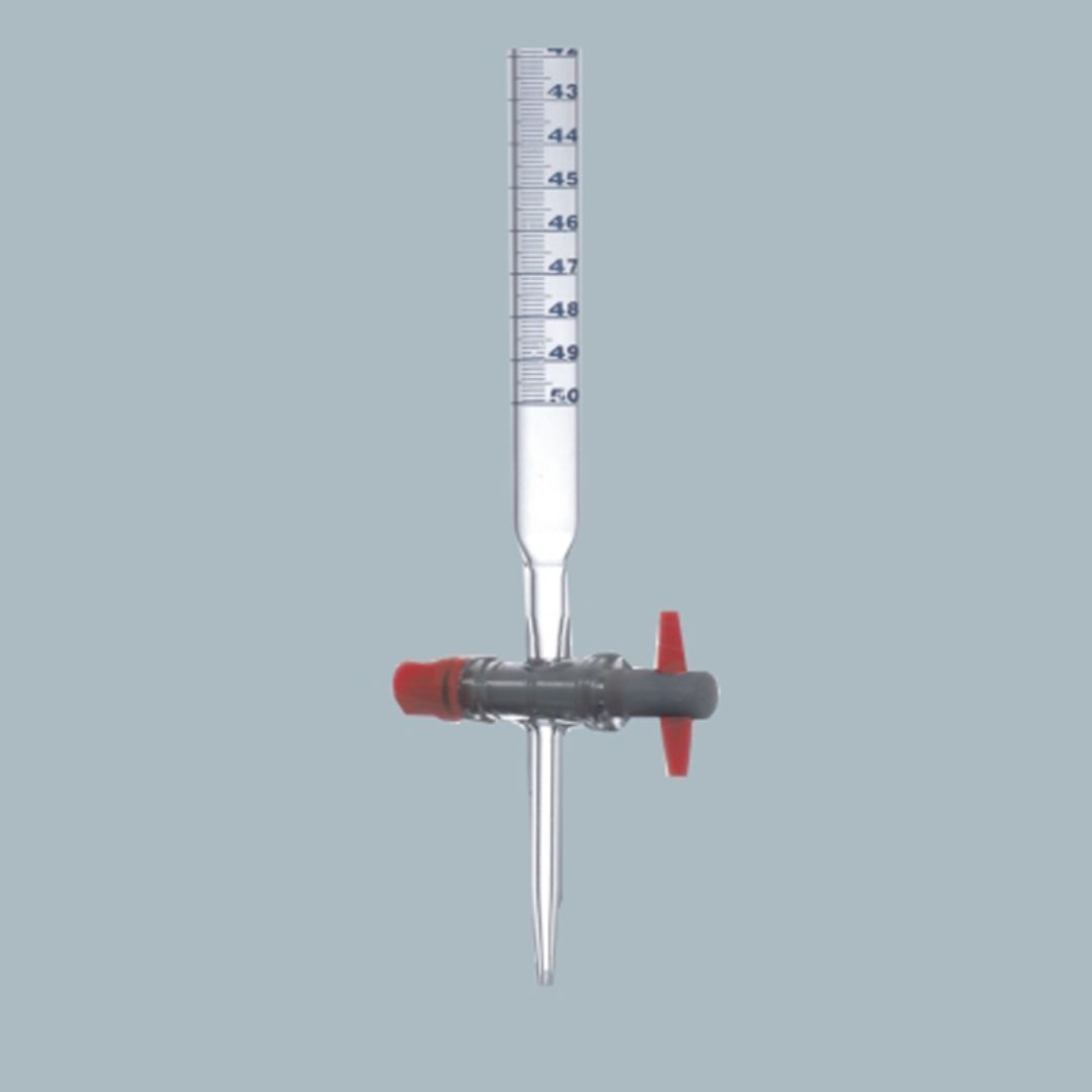 A burette with rubber typically refers to a laboratory glassware device known as a burette that includes a rubber or rubberized component as part of its construction. A burette is used for precise volumetric measurements of liquids, especially in titration experiments. The rubber component is usually found at the top of the burette and serves as a stopper or valve to control the flow of liquid from the burette into another container, such as a flask or beaker.